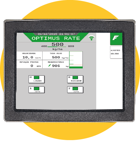 É um sistema que permite controlar, pela tela ISOBUS do trator, a taxa de aplicação, a rotação dos pratos, a abertura de comportas e até o acionamento automático do radiador, eliminando telas adicionais na cabine.